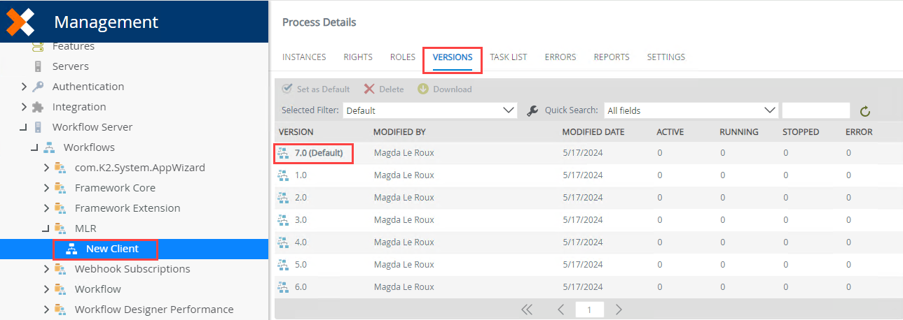 - In Management, browse to Workflow Server > Workflows. Select your workflow and click the Versions tab. Notice the default version of the workflow. In this example, the default version is 7.0 (Default), which aligns with version 7.0 in the Workflow Designer.