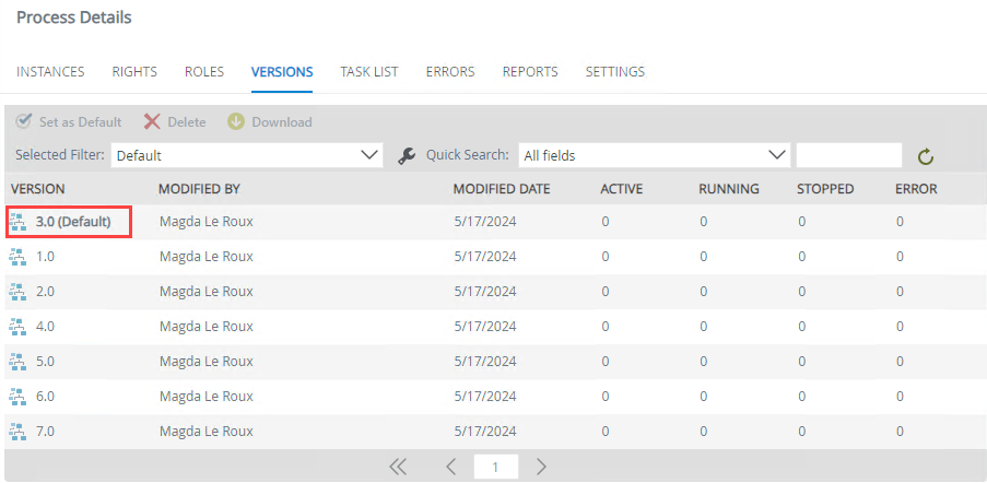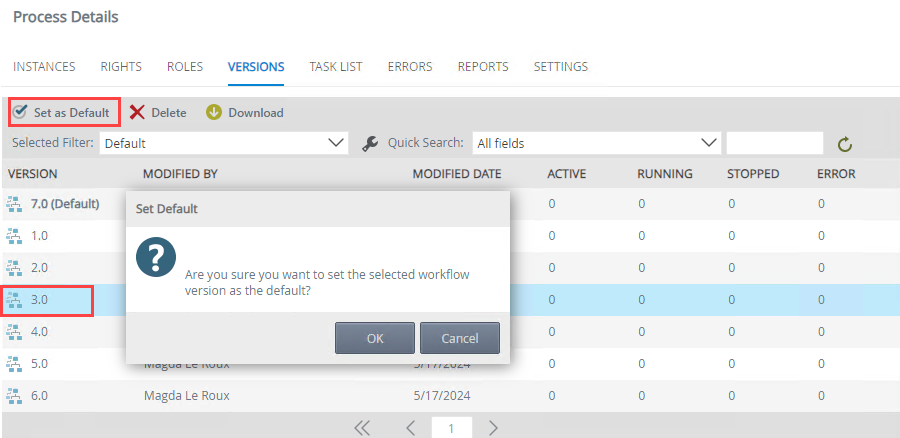 - To set another version of the workflow as default, select it and click Set as Default. In this example, we set version 3.0 as the default.