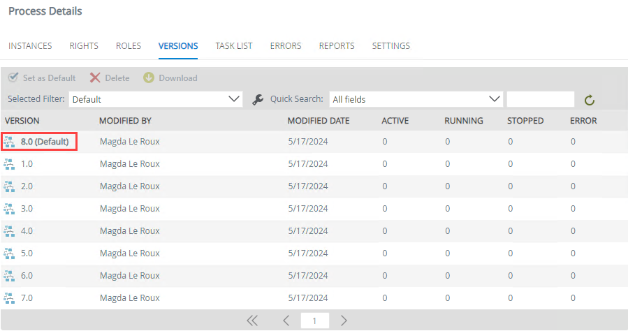 - Once you are finished making your changes to the workflow, deploy the workflow. When you deploy a new version of the workflow, the deployed version automatically becomes the default version, even if you previously set a different version as the default. In this example the newly-deployed workflow version shows as version 8.0 (Default) in Management after you deployed it. For more information on how to deploy a workflow, see the Deploy a Workflow topic.