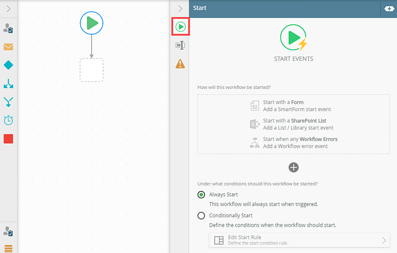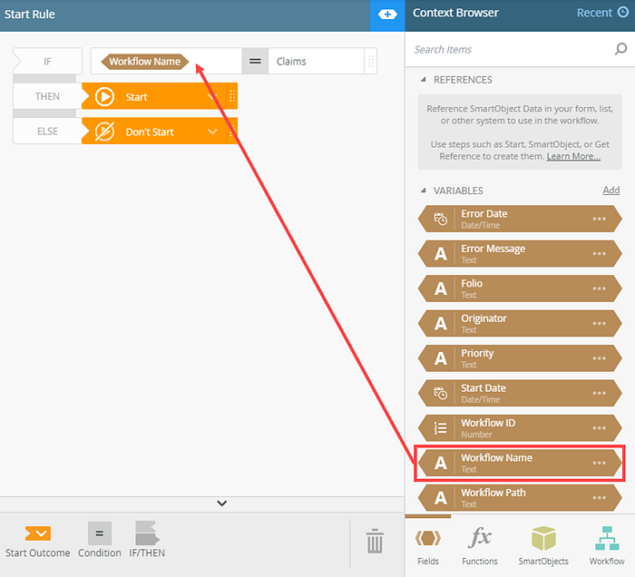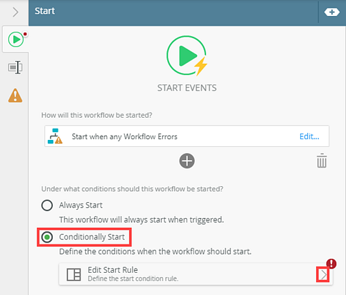 Keep in mind that if you use the Start when any Workflow Errors event, any workflow going into error state will start a new instance of the error handling workflow, and it becomes like a global "catch all" workflow. The global "catch all" workflow approach works in environments with few workflows in error state, and if you keep a simple configuration to the error handling workflow. When your error handling workflow contains multiple steps, such as user and server tasks, you can run into a scenario where potentially thousands of items flood your worklist and email inbox. You could also run into a multiple error state loop. It is recommended to have a simple global "catch all" error handling workflow that sends an email when any workflow goes into an error state. For more specific error handling, use a Conditional Start Rule to start the error handling workflow only if the erring workflow matches certain criteria. For an example on configuring a Conditional Start Rule on the Start when any Workflow Errors event, see the Example of an error handling workflow configured with a Conditional Start Rule section in this topic.