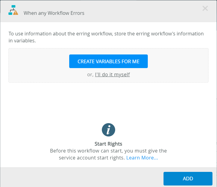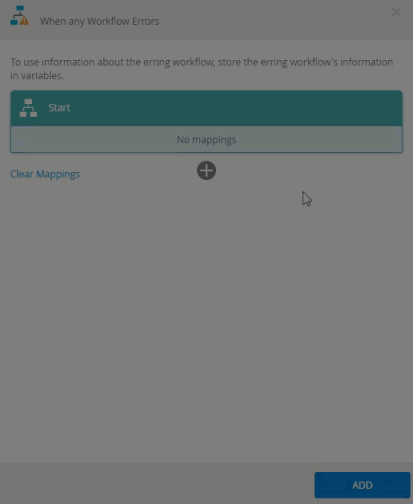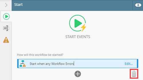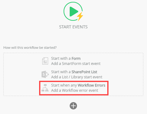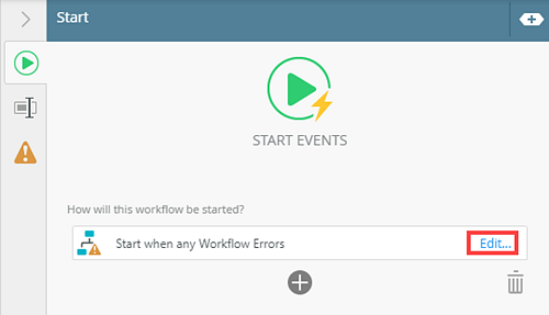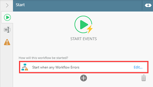 You can start a workflow when another workflow encounters an error by configuring a Start when any Workflow Errors start event. This event can start a new workflow instance when a workflow in your environment goes into an error state. Typically, you would start a workflow to handle errors, or to notify someone about the errors so that they can address or repair the errors.