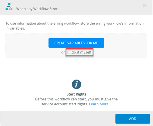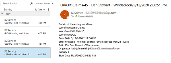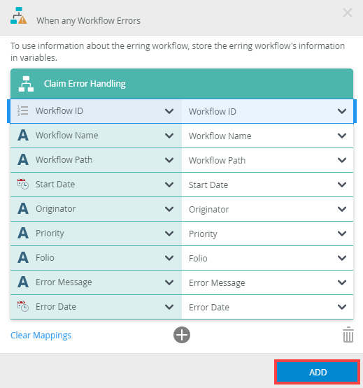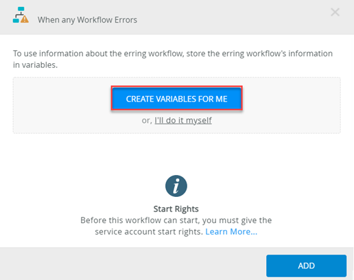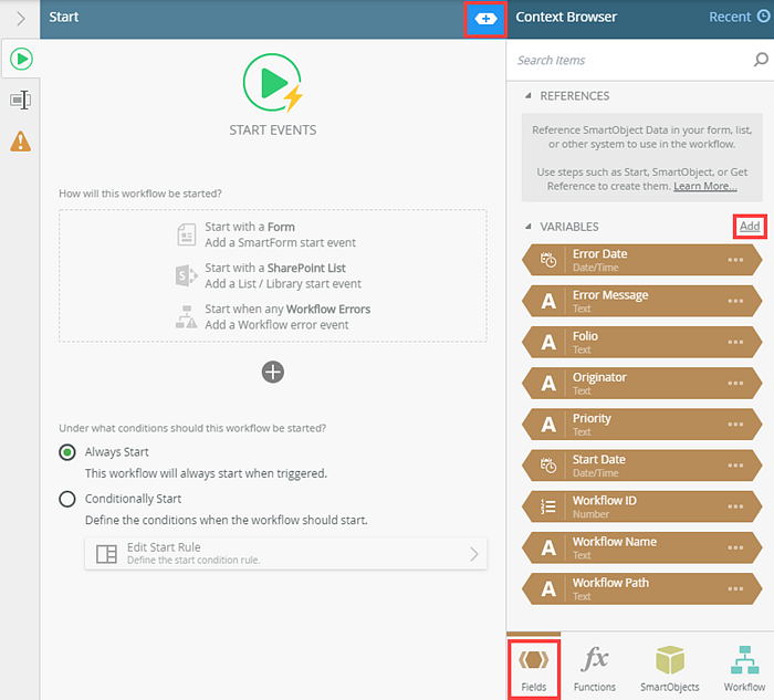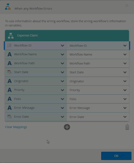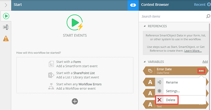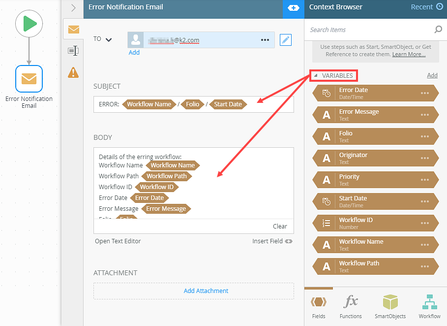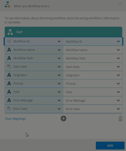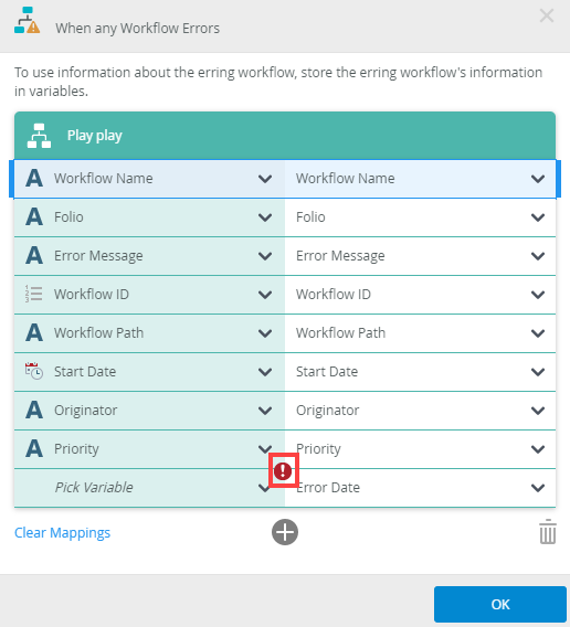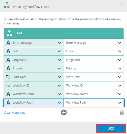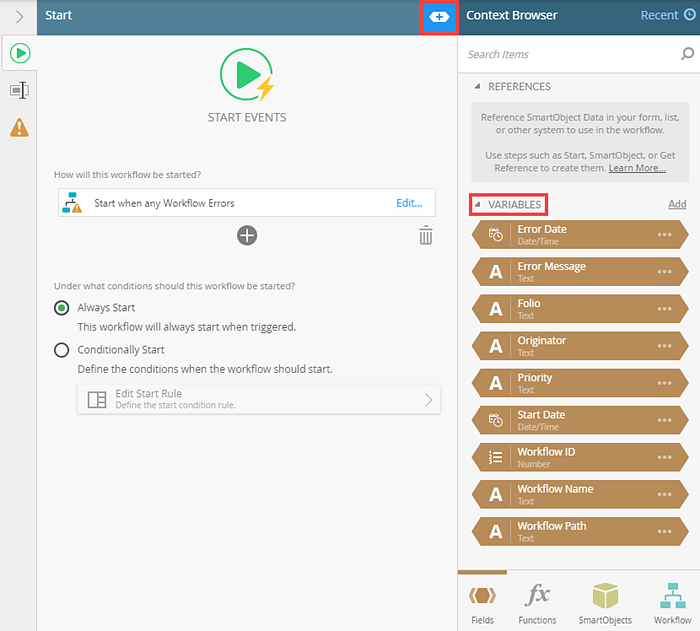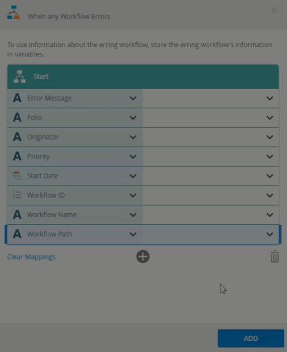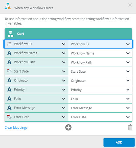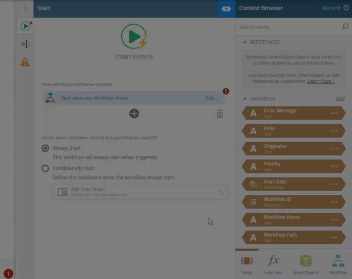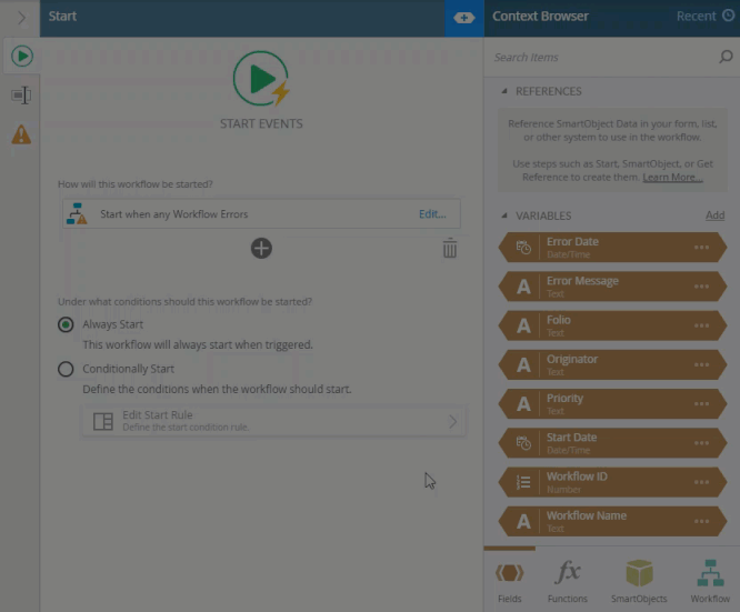 Instead of manually checking error logs, use the Start when any Workflow Errors event to start an error handling workflow to notify someone with an action task or an email. When you configure the Start when any Workflow Errors event, workflow properties from the erring workflow populate as variables in the error handling workflow. These include properties such as Workflow Name, Workflow ID, Folio, Error Message, and more. You can use these variables to populate the body of an email notification, or add details to the instruction section of a task with information from the erring workflow. You can also use the variables in SmartObject calls.