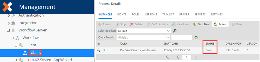 There are many reasons why a workflow might go into an error state. An easy way to simulate an erring workflow is to send an email to an invalid email address on the Send Email step, for example: bob2denallix.com instead of bob@denallix.com. The workflow runs, fails on the Send Email step, and goes into an error state. To see the erring workflow and error message, browse to Management > Workflow Server > Workflows > [workflow name] > Process Details > Errors tab.