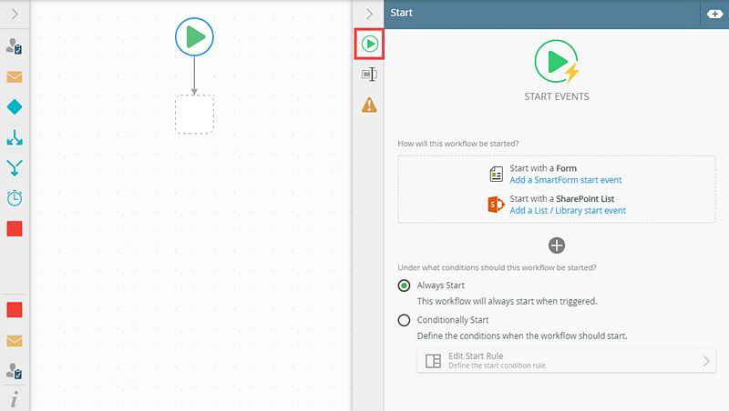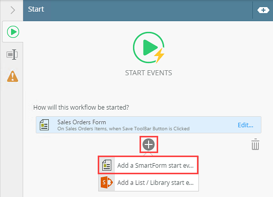 You can start workflows designed in the Workflow Designer by configuring a view or form rule. You can, for example, use a form to capture and retrieve data, and when the form is submitted, a workflow starts. You configure rules in the Rule Designer.