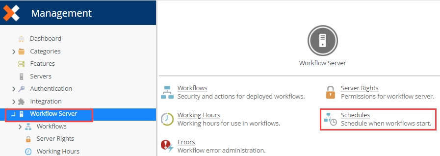 You can use the Schedules node in Management to create and edit workflow schedules. Schedules start an instance of a workflow at a particular date in the future, or with some type of recurring pattern (e.g. once a week).