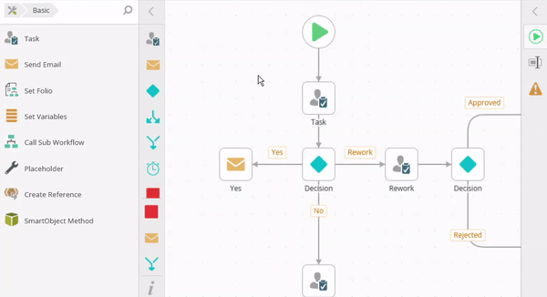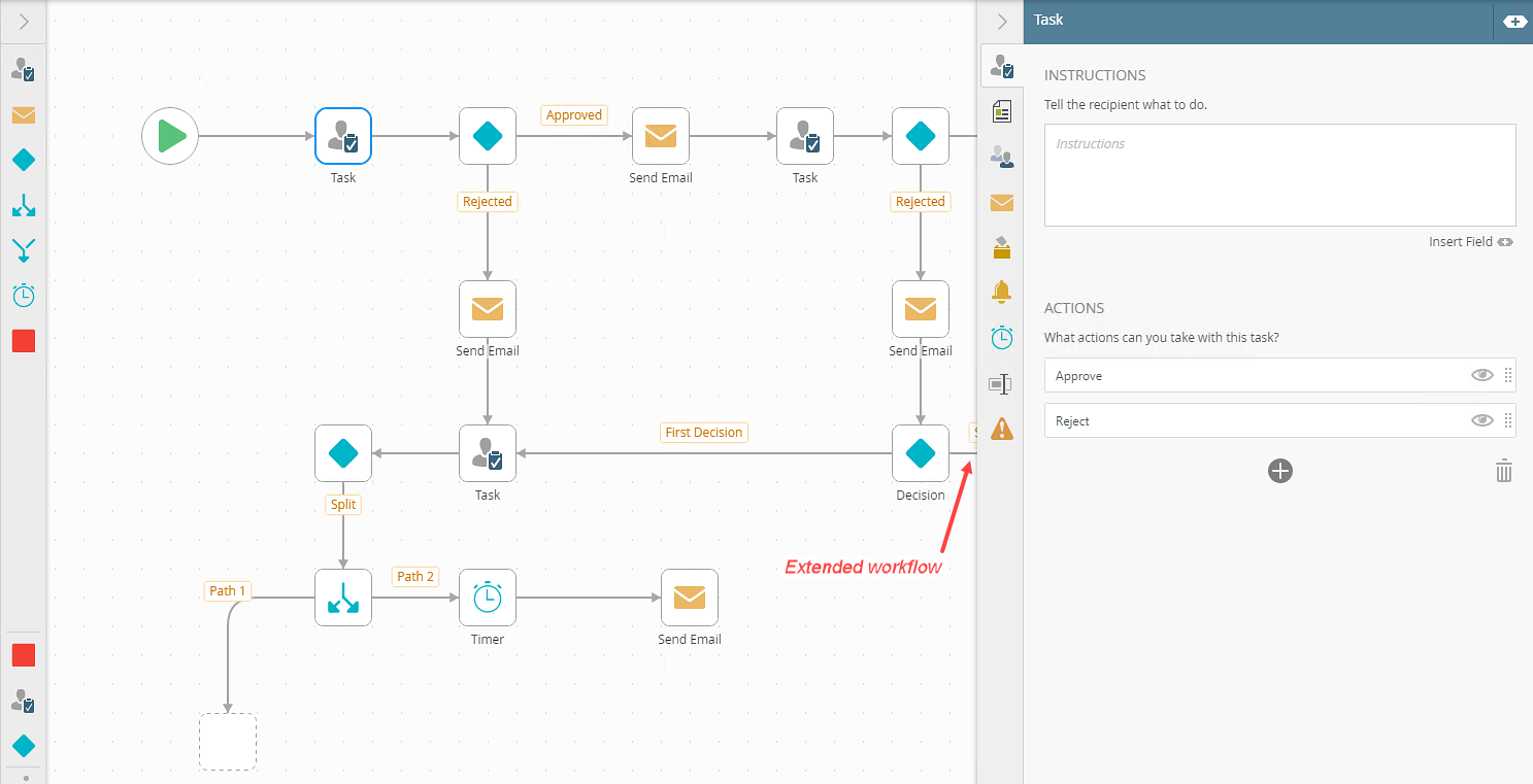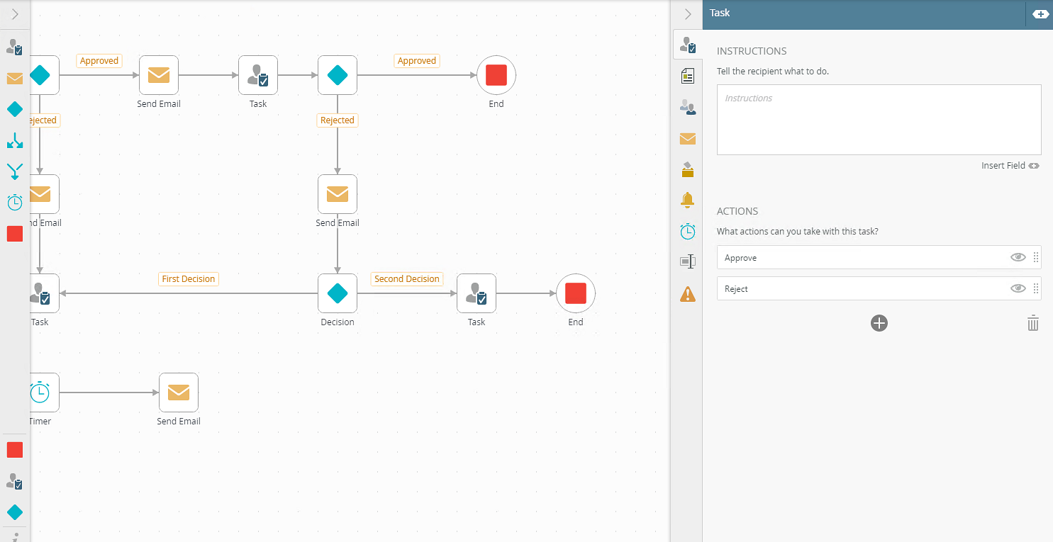 The dynamic canvas of the Workflow Designer provides you with an area to add steps and build workflows in all directions.