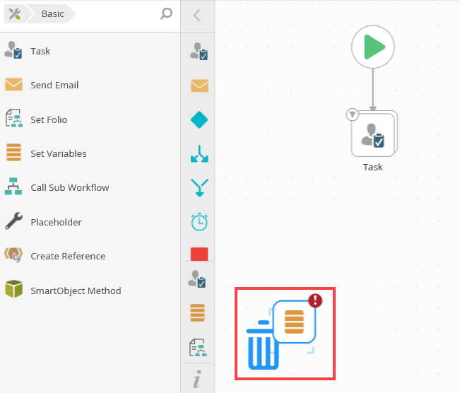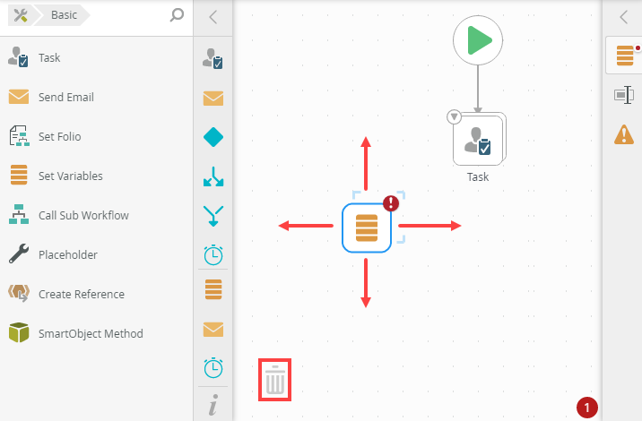 - Release and drop the step in the Trash bin. The step is removed from the canvas.