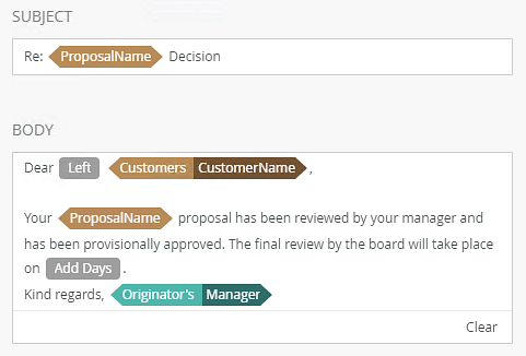 As the conclusion of the email, enter a salutation, like Kind regards, and then open the Workflow context tab of the Context Browser and drag Manager from the Originator section onto the signature area.