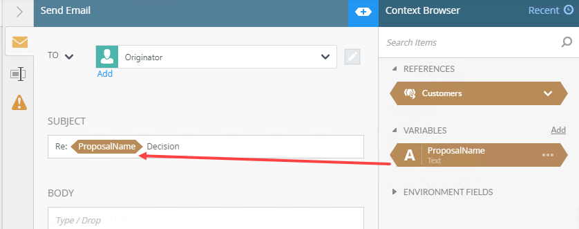 Drag the variable into the email Subject box. Complete it by adding Decision after the ProposalName field.