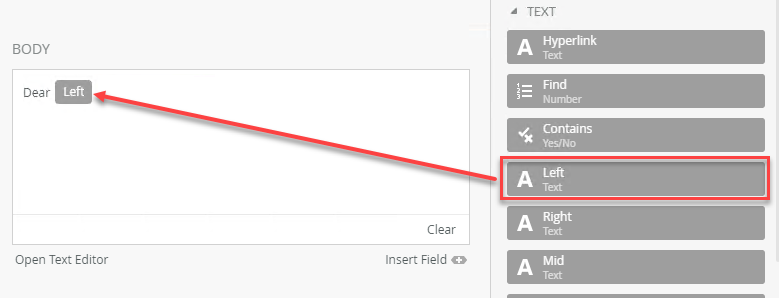 Open the Function tab of the Context Browser and drag the Left function onto the email. The SmartField Composer opens.