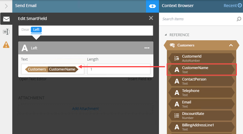 The employee data is available in the workflow through a reference item (the steps to create the reference item are not the focus of this topic and are not included). Open the Fields tab of the Context Browser, expand the Reference, and drag the CustomerName object into the Left text function and enter a Length value of 1.