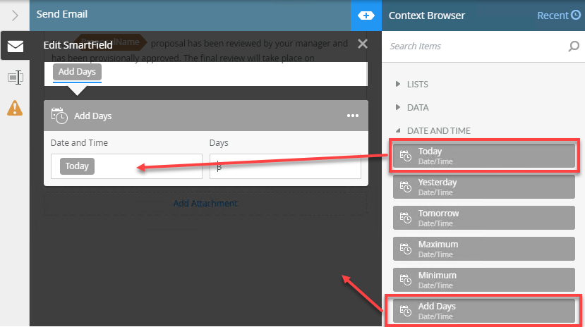Your (drag the ProposalName Process field object here) proposal has been reviewed by your manager and has been provisionally approved. The final review by the board will take place on. Then open the Functions tab of the Context Browser and drag the Add Days function from the Date And Time functions onto the end of the sentence. The Smartfield Composer opens.