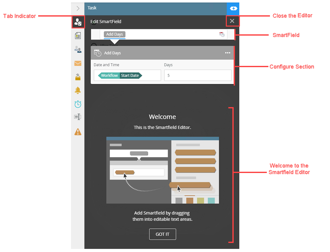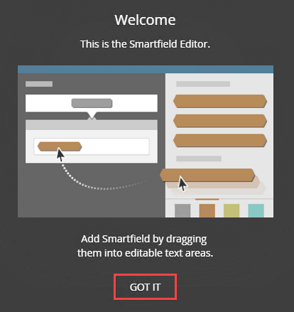 This is a Welcome message with short introduction to the Smartfield Composer. This message disappears when you start configuring the functions and SmartObjects. To remove it permanently, click the Got It button.