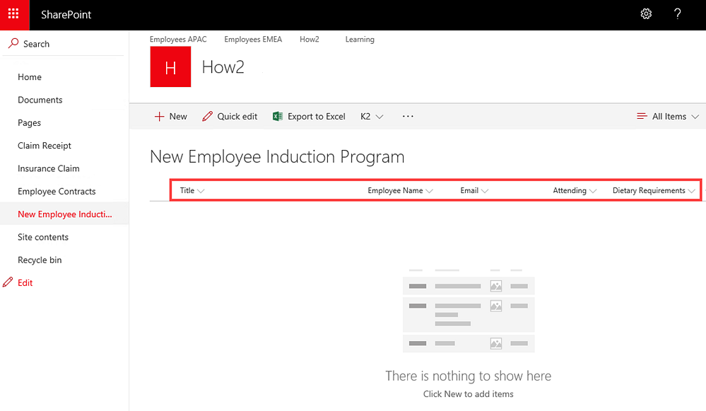 - Create the New Employee Induction Program list in SharePoint as shown below. This list stores employee details.