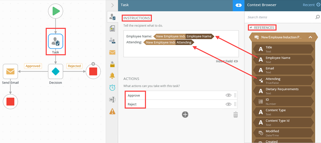 - Drag the Task step onto the canvas. Add Approve and Reject as the task actions. From the Context Browser panel, expand the New Employee Induction Program references. Locate Employee Name and Attending properties from the reference and configure the Instructions as shown below.
