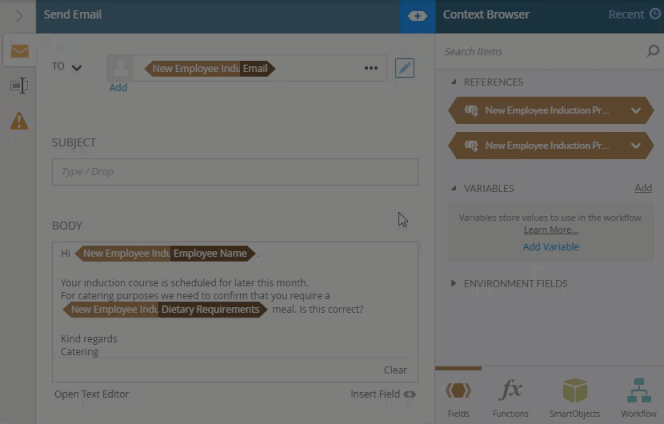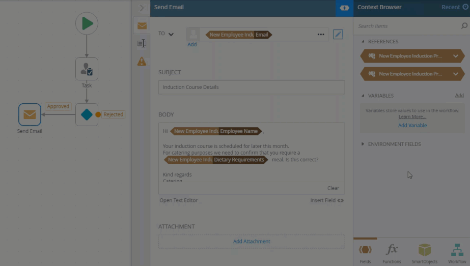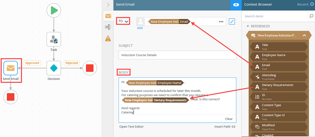 - Drag a Send Email step onto the canvas as the outcome to the approved path. Use the New Employee Induction Program reference to configure the To email address and the Body of the email as shown below.