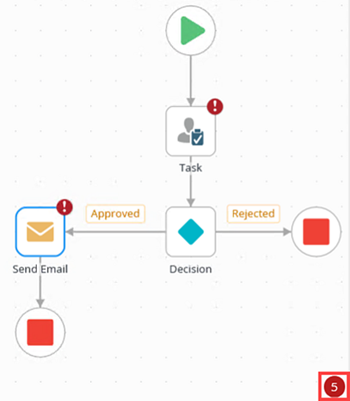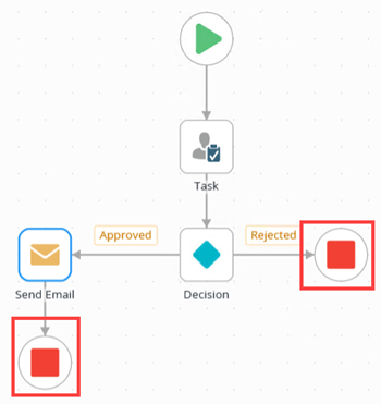 - Drag two End steps onto the canvas and connect them to the Send Email step and the Rejected task action. This allows you to deploy the workflow.