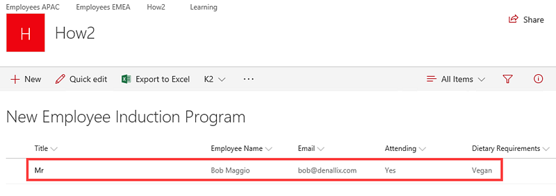 - In SharePoint, add a new item to the New Employee Induction Program list.