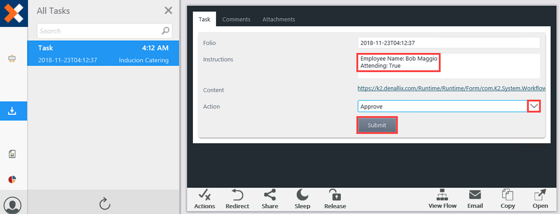 - Adding the new item starts the Induction Catering workflow and a task is sent to the HR representative. In this case it was sent to the Administrator. As Administrator, open Workspace (Desktop) to view the task. Notice the instructions are populated with the employee name and attendance detail. In this case the employee is Bob Maggio and he will be attending. From the Action menu select Approve and click Submit.