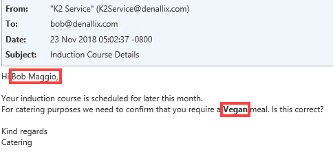 - An email is sent to Bob to confirm his dietary requirements. Log in as Bob and open the email. Notice the email body populated with the employee name and dietary requirement. In this case Bob requested a vegan meal.
