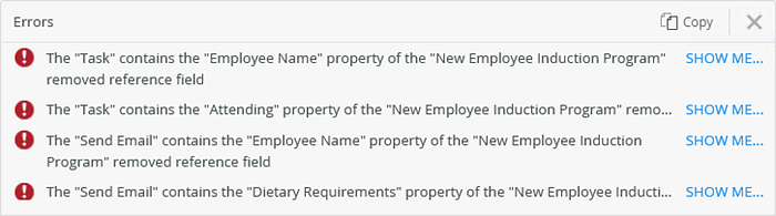 - The error console opens. In here you find a description of the errors and on which step they occur. In this example, the Employee Name property in the Send Email step has a removed reference field.