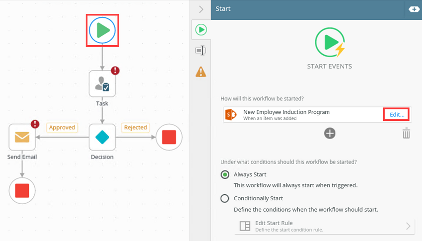 To recreate the reference, reconfigure the New Employee Induction Program SharePoint list event on the Start step.