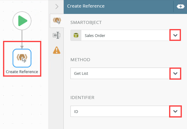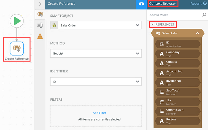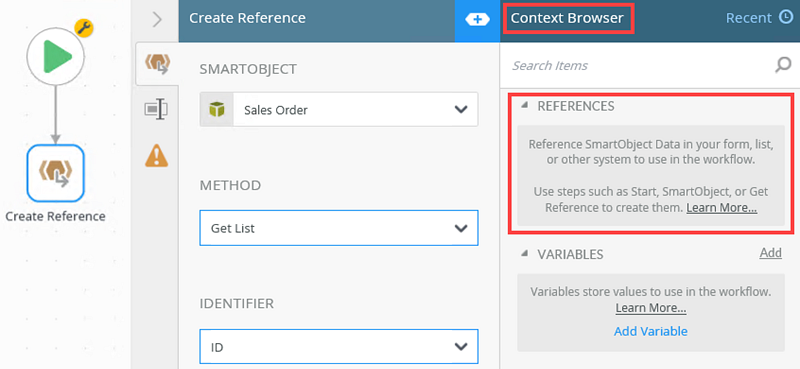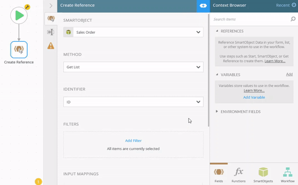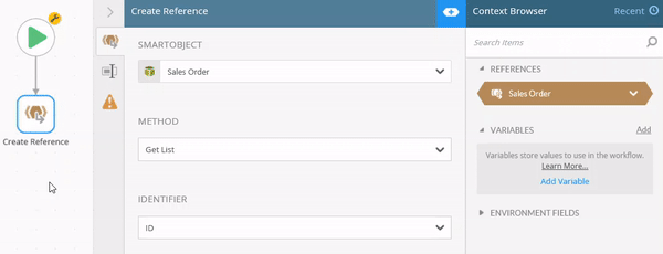 In this example, you add a Create Reference step to your workflow and configure the Sales Order SmartObject Get List method.