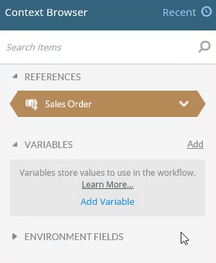 Open the Context Browser and find the reference you want to delete. In this scenario, the Sales Order reference was created when you configured the Create Reference