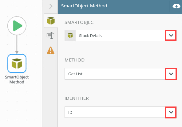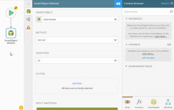 In this example, you add a SmartObject Method step to your workflow and configure the Stock Details SmartObject Get List method.