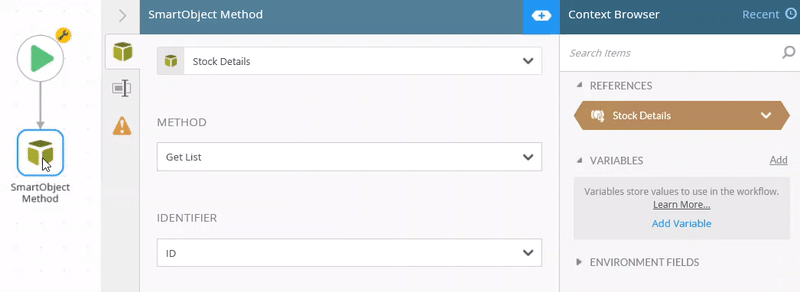 On the canvas, select the SmartObject Method step and delete it. Use the Delete key on your keyboard. Notice the Stock Details reference no longer shows in the References section.