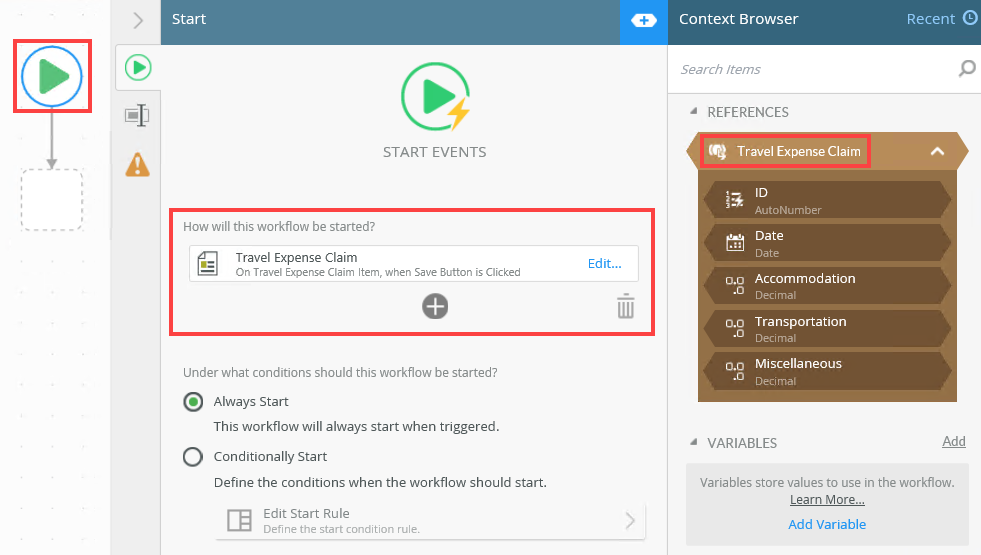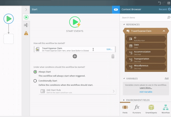 In this example you use a form to start a workflow when the Savebutton is clicked. When you configure the Start step, the Travel Expense Claim reference is created.