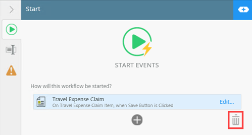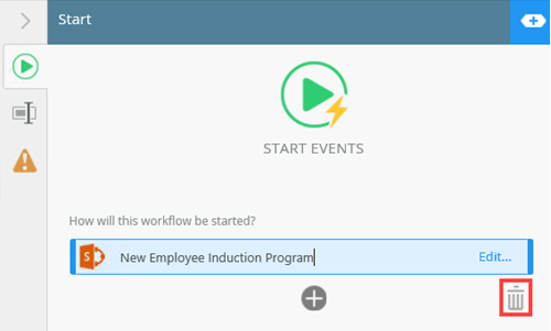 On the Configuration Panel, select the New Employee Induction Program SharePoint event and click the Trash bin icon.