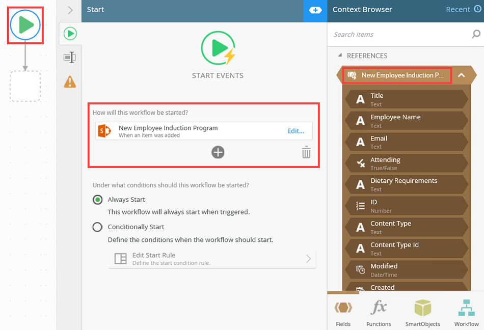 - Create a workflow called Induction Catering. In this example, you configure the Start step in the workflow to start when an item is added to the SharePoint list. Step through the wizard and select the New Employee Induction Program list and Do it for me! option. This automatically creates the references. You can integrate the list with K2 for SharePoint to start the workflow, but in this example you set it up from the Workflow Designer side.