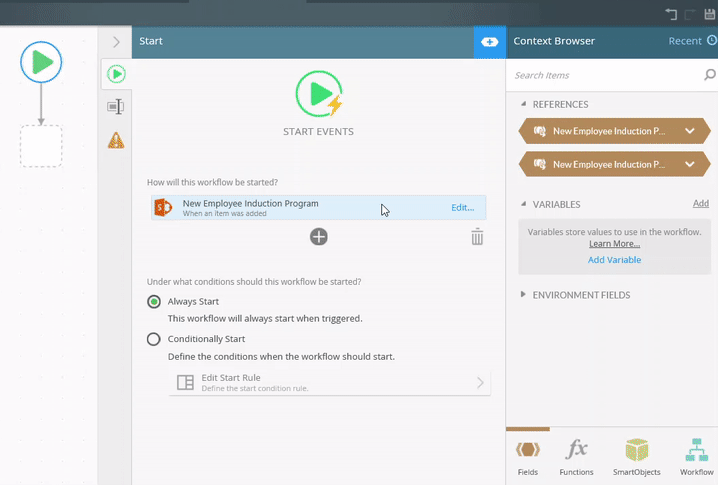 You create references to items such as documents, subsites, list items, forms, and SmartObject results, and then reuse that information anywhere within the workflow. In many cases, references are created automatically for you, but you also have the option to create your own. You can create multiple references and reuse them throughout the same workflow. References are created when you: