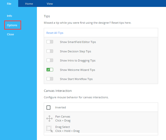- On the Options section you can enable or disable tips and configure mouse behavior for the canvas.
