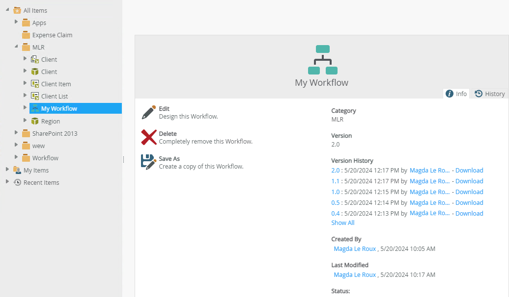 | Dates | The Date section shows the Last Modified and Created date of the selected workflow. |
