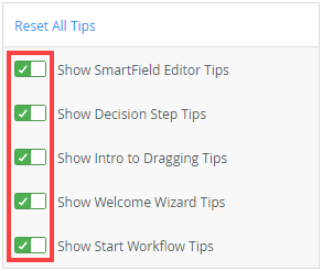 Use the sliders to enable or disable any of the following tips: Once you click Got It in the workflow designer, the tip gets disabled and you'll need to enable it from the Tips section again. |