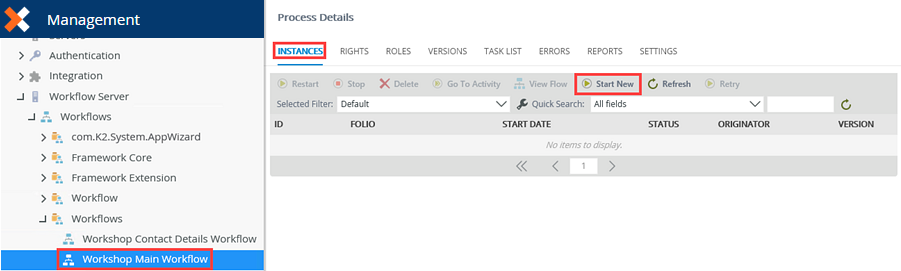 - In this example, start the main workflow (Workshop Main Workflow) from Management site. Click Start New.