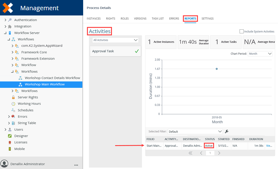 - From the Workshop Main Workflow Process Details click the Reports tab. To view the active instance, scroll down to the Activities section of the report. Notice the main workflow is active.