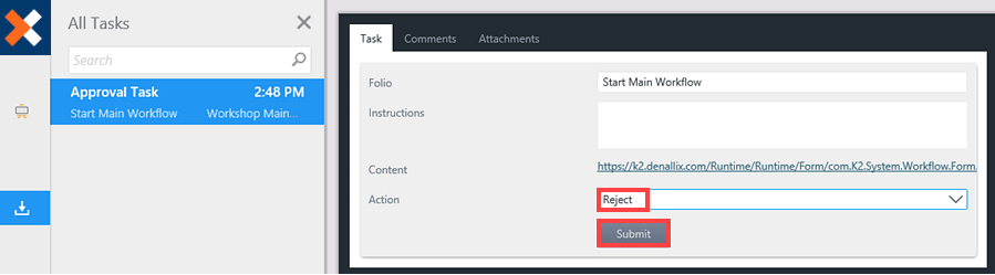 - Open Workspace, and from the Denallix Administrator task list, select Reject and click Submit.
