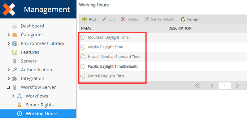 - You can define working hours on your environment to store the working hours for your organization, or to create different zones for different departments and offices in the organization. To configure them, click the working hours link. You must have access and admin permissions in Management to set the working hours. For more information on how to set your working hours see Work Hours. In this example, five different working hours are available in your organization.