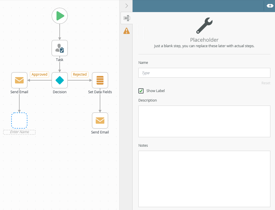 If you add a Logic step (Decision, End, Merge, Split, Timer or Loop) onto a Placeholder step and no label is already specified for the Placeholder step, the Show Label check box will be unchecked. Check the check box to show the label. Dragging other types of steps onto the placeholder will retain the label applied for the Placeholder step and the Show Label check box will be checked.