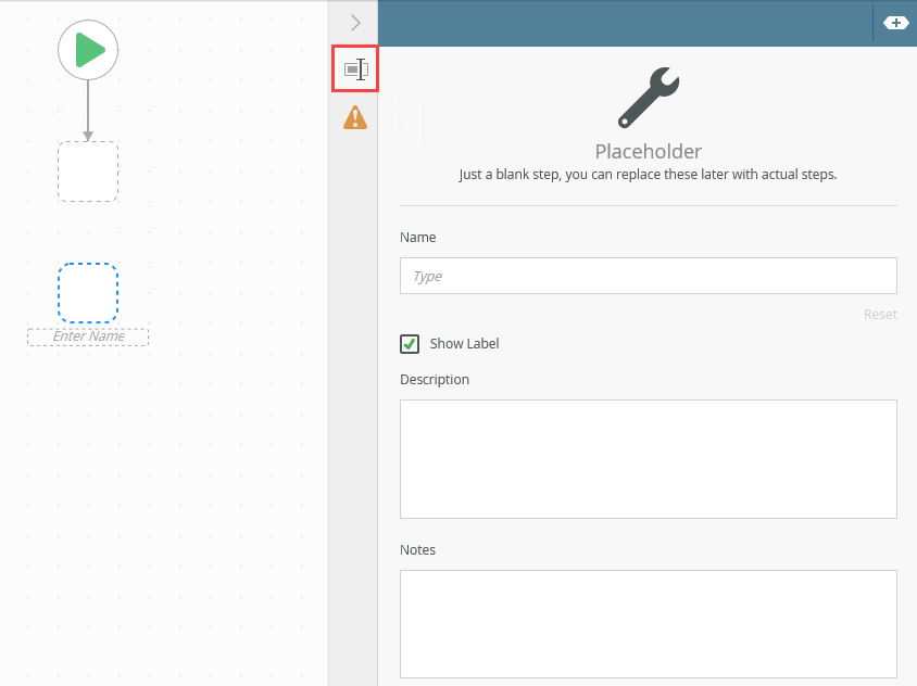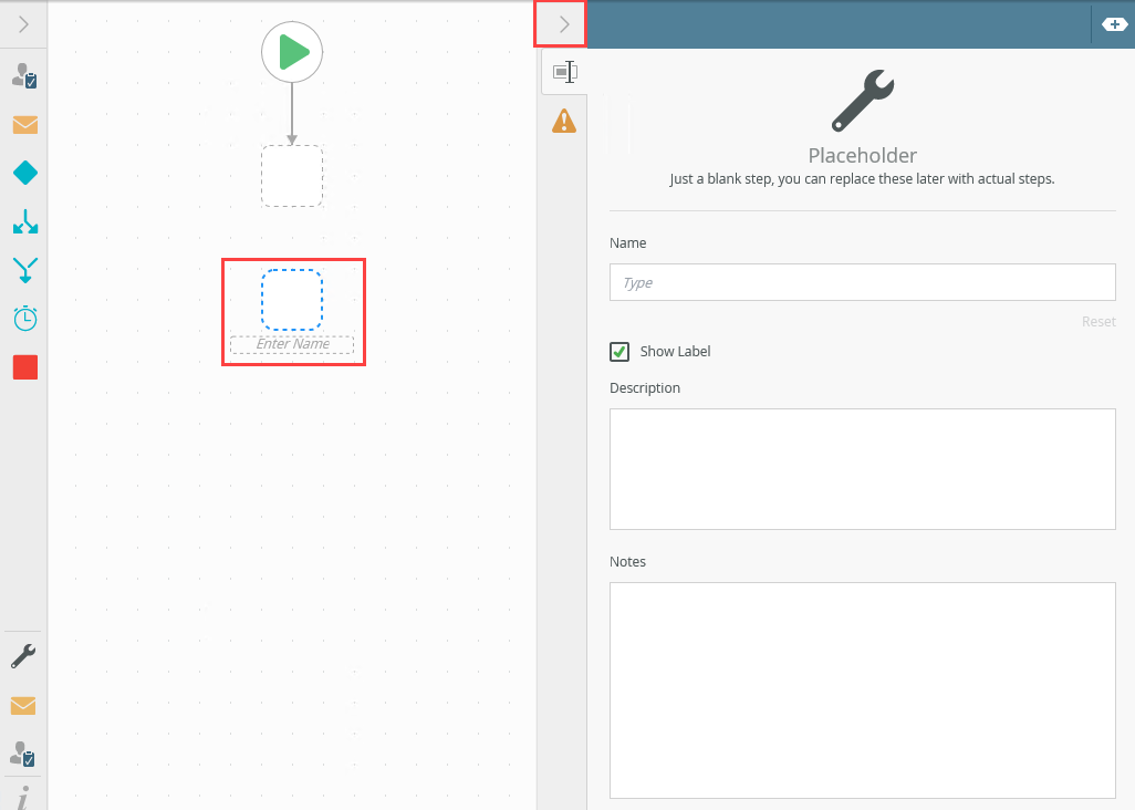 - When dragging a step onto the Placeholder step, the Name field changes according to the step replacing the Placeholder step, but only if the name of the Placeholder step was not configured beforehand. If you previously configured the Placeholder step's Name and then drag a step onto this Placeholder step, the added step name inherits the Placeholder step's name. Example: You rename the Placeholder step Name to My Placeholder. You drag a Send Email step onto the Placeholder step. The Send Email step name is My Placeholder.