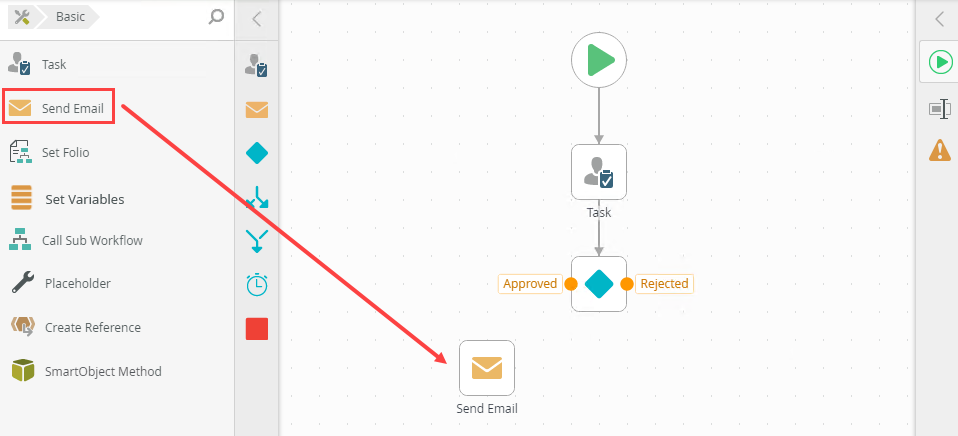 Drag the Send Email step from the Basic category, Favorites bar, or the Recent category onto the canvas.