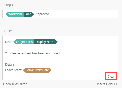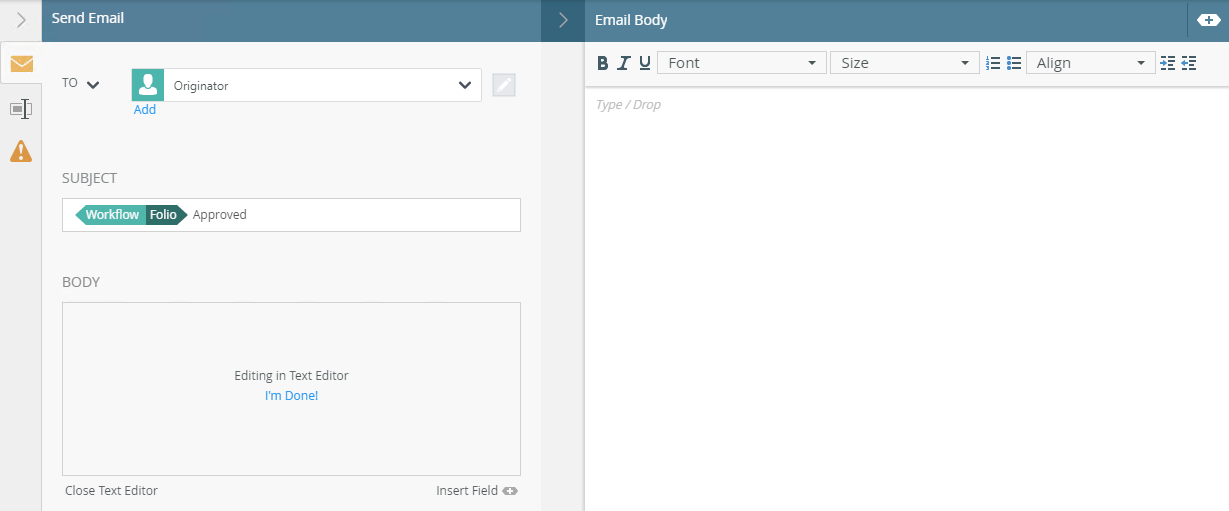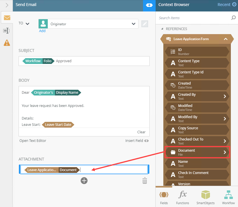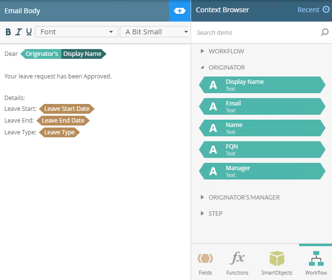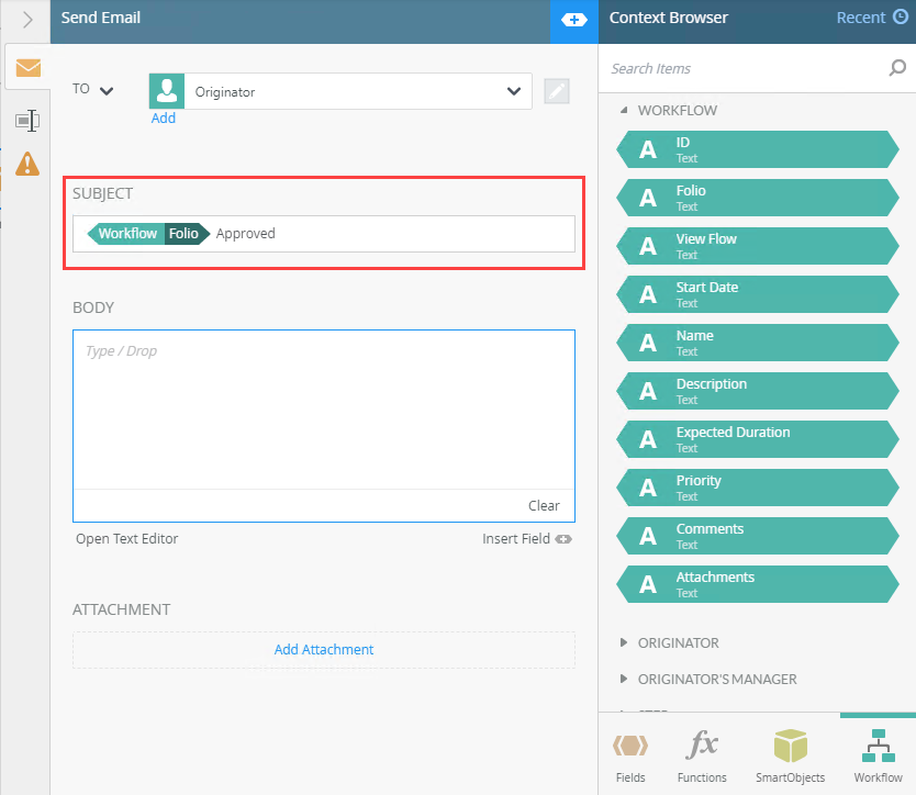 Use the Send Email step to send an email in workflow step. Emails can have formatting, links, attachments, and data from the workflow, SmartObjects and other systems.