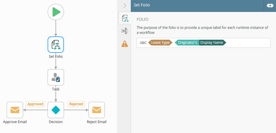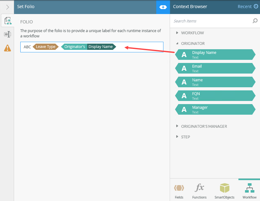 - Customize the folio field with a combination of text and values. You can drag Functions, Fields, SmartObjects and Workflow related items from the Context Browser into this field.