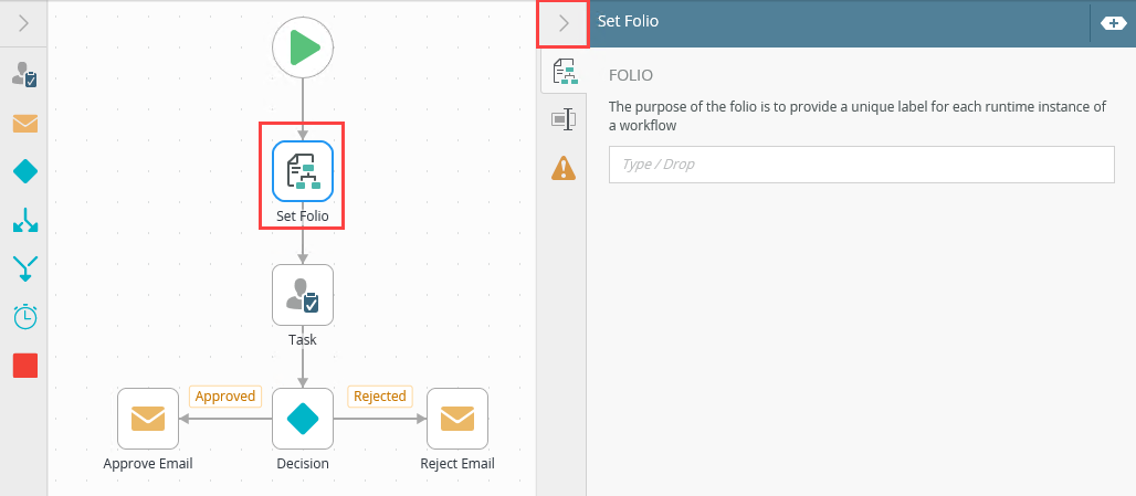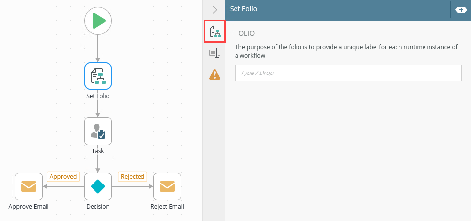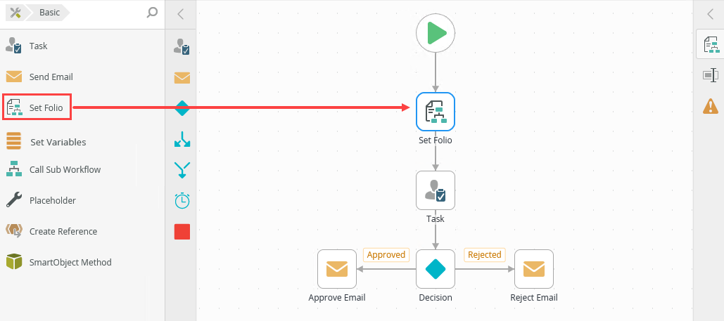 - From the Toolbox click the Basic category, then drag the Set Folio step onto the canvas.