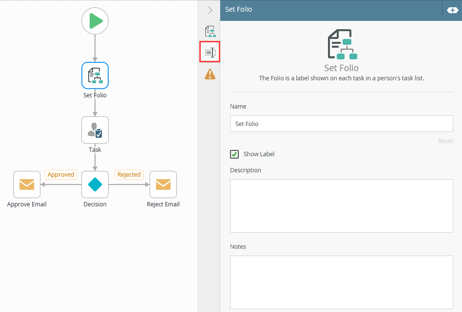 Use the Set Folio step to change the folio value at any point in the workflow. This can be useful to track changing values throughout the workflow lifecycle, such as when a time frame (such as a ship date) needs to be recalculated.
