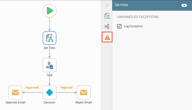 - The exceptions in the table above is an example of those available in Workflow steps. The exceptions available depend on the Workflow step used in the design canvas.