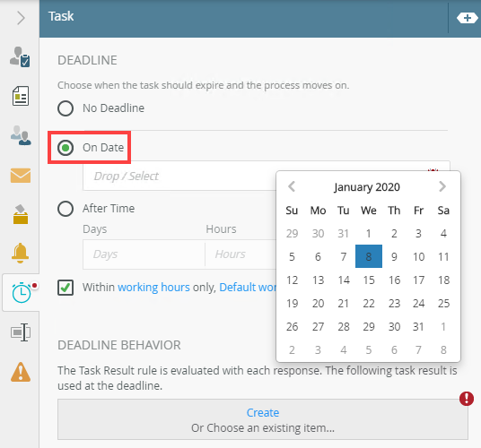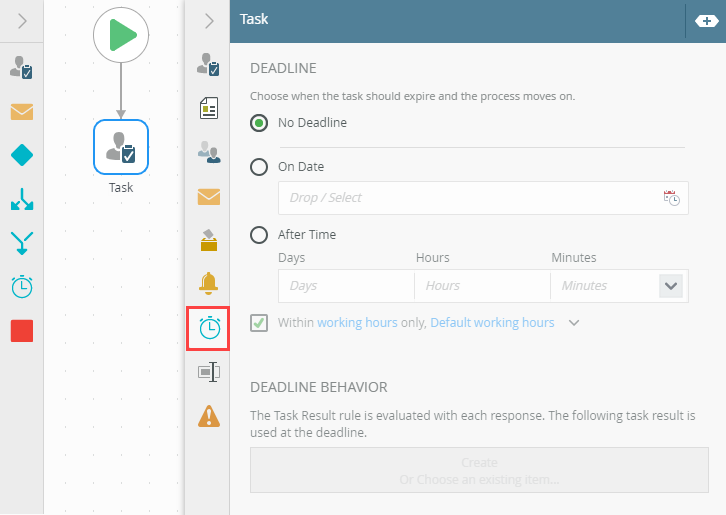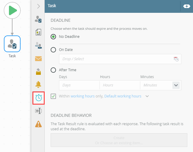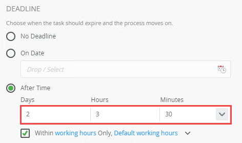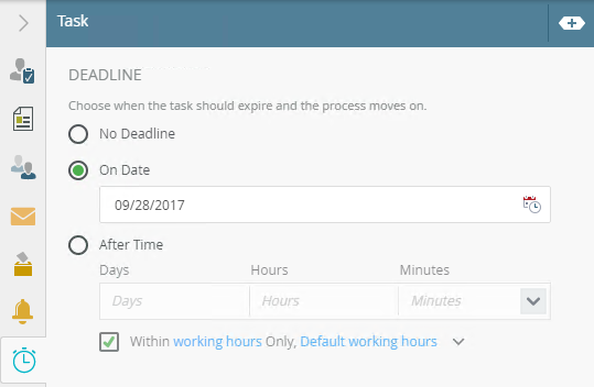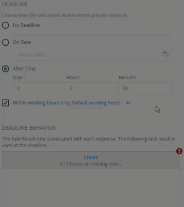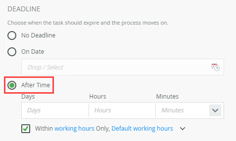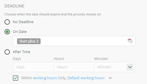 This allows you to set the deadline to occur within specified working hours. If you select one of these options (On Date or After Time), the task expires on a specific date or after the set time within the specified working hours. If you don't select this option, the deadline does not take these hours into consideration (so in most cases the deadline occurs sooner).